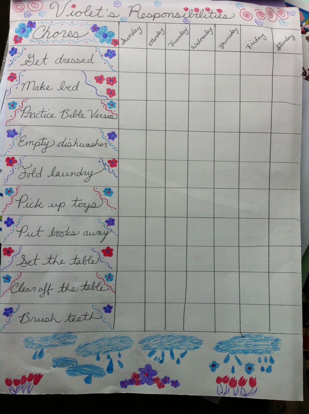 I think I originally read about this idea somewhere else, but it has been a wonderful help to me and is reusable which is always great! I wanted to share with you what I personally use at home to keep up with regular household chores that need to be done. You can easily make one of these yourself and use it to help keep your home organized and stay on top of your chores. Here are the two charts I have:
